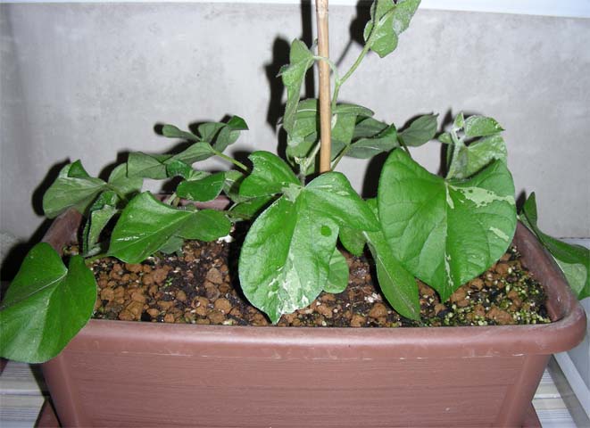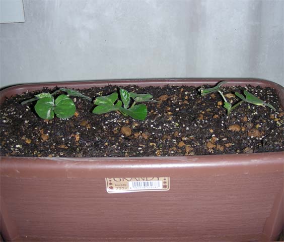 朝顔 5月の連休中に蒔いた朝顔がこんなに伸びた。真ん中のは蒔いて直ぐに生えた株。ほかの2本も比較的直ぐに芽が出た。蒔いたときは室内だったので、とても暖かく、しかし陽はよくあたらないのでひょろひょろだったのが、今はこんなに普通になっている。 下の方は両端が今月に入ってから芽が出たもので真ん中が上のと同じ時期。真ん中が小さいのは根っこが完全に露出して長いこと育たないままだったから。植え替えで土をかけたらちょっとは元気になったようだ。右端のは先週芽が出たばかり。暖かいからすぐにこんなに育った?